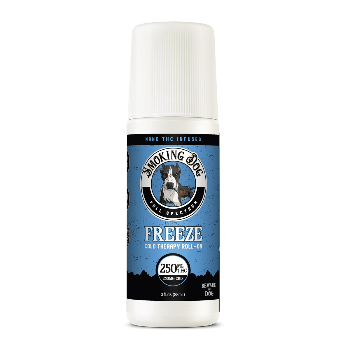 Tackle pain right at the source with Smoking Dog 1 to 1 Roll on Freeze. Each 3oz Freeze contains 250mg of Delta 9 paired with 250mg of CBD. Cold therapy minimizes muscle pain and inflammation, while our proprietary Skin Retention Technology allows the cannabinoids to better penetrate the layers of the skin, and stay on the skin longer, for lasting relief.