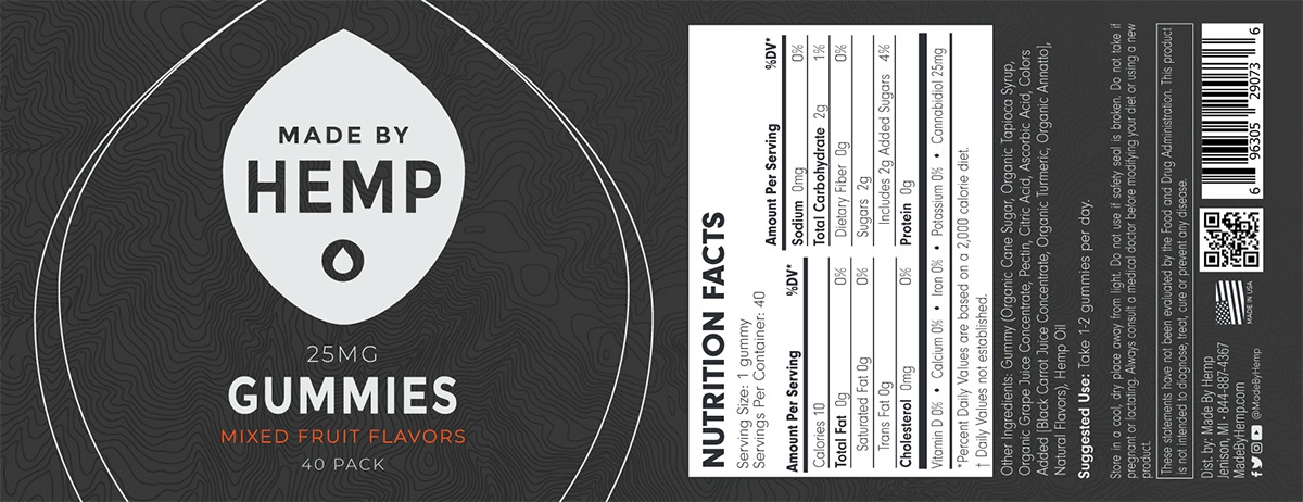 Ingredients: Gummy (Organic Cane Sugar, Organic Tapioca Syrup, Organic Grape Juice Concentrate, Pectin, Citric Acid, Ascorbic Acid, Colors Added [Black Carrot Juice Concentrate, Organic Turmeric, Organic Annatto], Natural Flavors), Hemp Oil