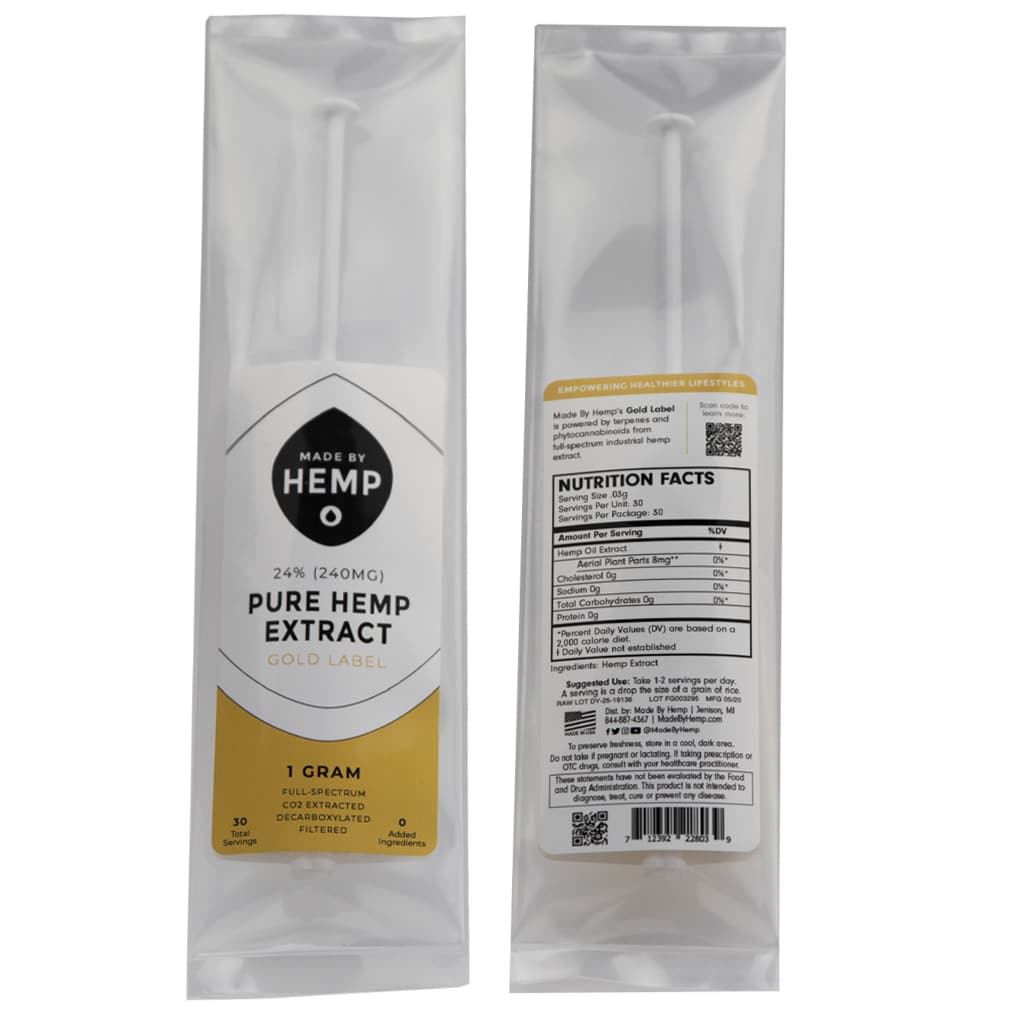 The Gold CBD oil concentrate is the 3rd and final stage for our three concentrates. It is filtered to remove all extra plant parts, and thus increasing the CBD concentration within the product. This changes the color of the oil to a light orange/gold color and the consistency of the oil to a gel. When working with all-natural raw materials like hemp oil, they can and do vary from batch to batch. Thus, on occasion, the gel consistency can be runnier or even a more solid. If it is runnier than you’d like, simply store it in your fridge to help firm up. If it is more firm than you’d like, simply run the syringe under warm water in the sink until loosened and dispense from there.