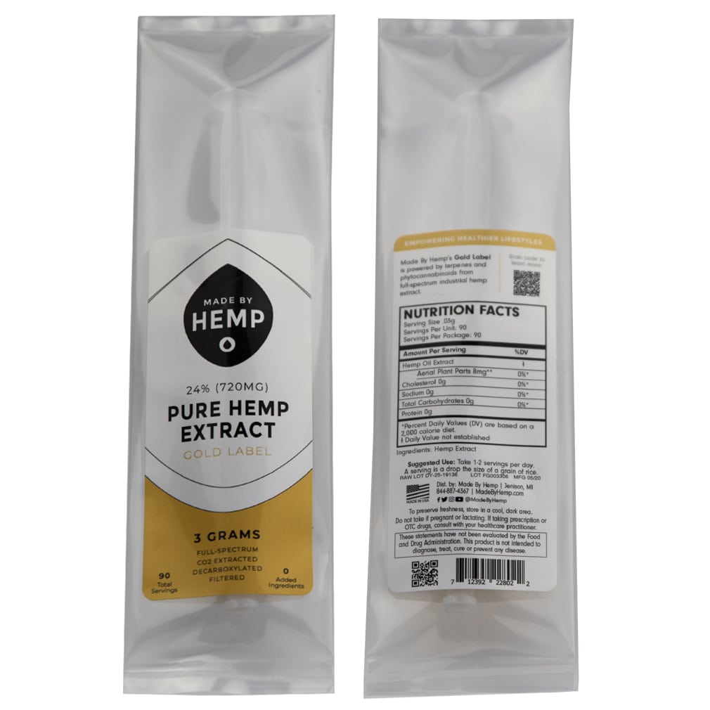 The Gold CBD oil concentrate is the 3rd and final stage for our three concentrates. It is filtered to remove all extra plant parts, and thus increasing the CBD concentration within the product. This changes the color of the oil to a light orange/gold color and the consistency of the oil to a gel. When working with all-natural raw materials like hemp oil, they can and do vary from batch to batch. Thus, on occasion, the gel consistency can be runnier or even a more solid. If it is runnier than you’d like, simply store it in your fridge to help firm up. If it is more firm than you’d like, simply run the syringe under warm water in the sink until loosened and dispense from there.