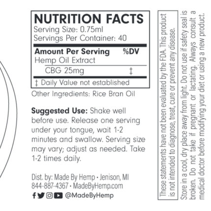 Ingredients: Raw Hemp Oil, MCT Oil, Grapeseed Oil, Organic Sunflower Oil, Organic and Natural Flavors, Stevia, Terpenes